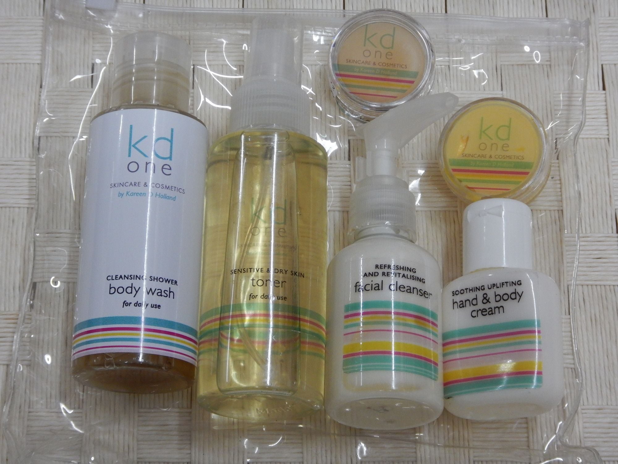 Cleanser 65ml, Toner 95ml, Body Wash 95ml, Lipbalm 10ml, Daily Moisturiser 10ml, Body wash 95ml.